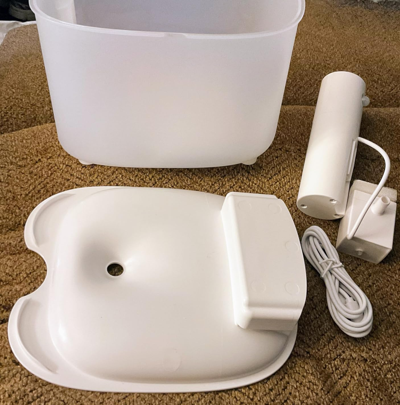 Itβs super quiet and easy to put together. I love the pink design with the blue light. It hasnβt leaked and the product is good material, itβs light weight and easy to change out! The water dosent become stagnant because itβs constantly cycling with the waterfall effect. My cat looks at it as a toy and loves to watch it come out and drink out of the fountain lol